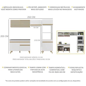 Dimensões do produto montado: Cozinha - Altura: 203cm | Largura: 252cm | Profundidade: 31cm (aéreos) - 53cm (paneleiro e balcão com tampo) Espaço para fogão/geladeira - Altura: 170cm | Largura: 70cm *Você pode consultar as medidas internas na imagem técnica do produto.