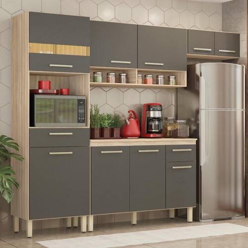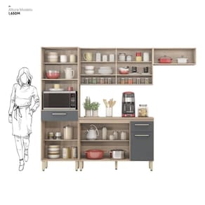 A Cozinha Compacta Laos oferece design atemporal e combinações de cores elegantes, criando um ponto de destaque na sua cozinha. Com paneleiro para micro-ondas, armários aéreos e um balcão para organizar utensílios e eletroportáteis, ela otimiza o armazenamento. A ampla bancada é perfeita para o preparo de alimentos ou para montar um cantinho do café. Equipado com pés reguláveis, garante nivelamento e proteção contra a umidade, aumentando a durabilidade.