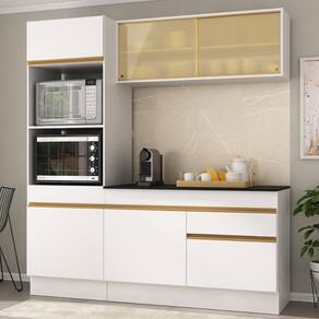Armário De Cozinha Compacta 3 Peças Com Rodapé Mp2178 Made Multimóveis Branco/dourado Branco/dourado O Armário de Cozinha Compacta 3 peças com Rodapé MP2178 Made Multimóveis é produzido em MDP 12/15mm com acabamento acetinado (cerca de 20% de brilho), que garante maior durabilidade e resistência. Com amplo espaço interno para organizar todos os itens de cozinha, este conjunto possui 6 portas (sendo 2 de correr em vidro reflecta e 2 basculantes), prateleiras, 1 gaveta com corrediças metálicas (mais leveza no manuseio), puxadores em ABS e rodapés que deixam o ambiente mais sofisticado. Os módulos são individuais, podendo ser montados da maneira que se adaptarem melhor ao seu ambiente. Para deixar sua cozinha mais completa e organizada, acompanha balcão com tampo removível (compatível com pia de 120cm), módulo para forno e micro-ondas, além de compartimento especial para utensílios mais altos. Esta é uma opção elegante e funcional para o seu cantinho culinário! Conteúdo da Embalagem: 1 (um) Armário Aéreo com Portas de Vidro 120cm 1 (um) Balcão com Tampo 120cm 1 (um) Armário para Forno e Micro-Ondas 62cm