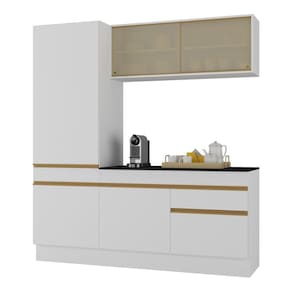 Armário De Cozinha Compacta 3 Peças Com Rodapé Mp2179 Made Multimóveis Branco/dourado Branco/dourado O Armário de Cozinha Compacta 3 peças com Rodapé MP2179 Made Multimóveis é produzido em MDP 12/15mm com acabamento acetinado (cerca de 20% de brilho), que garante durabilidade e resistência. Com amplo espaço interno para armazenar seus utensílios, este conjunto possui 6 portas (sendo 2 de correr em vidro reflecta e 1 basculante), prateleiras, 1 gaveta com corrediças metálicas (mais leveza no manuseio), puxadores em ABS e rodapés que embelezam o ambiente. Os módulos são individuais, permitindo sua montagem da forma que se adaptarem melhor no ambiente. Para tornar o produto ainda mais funcional, acompanha balcão com tampo removível (compatível com pia de 120cm), módulo para forno e micro-ondas e compartimento especial para utensílios mais altos. Esta é uma ótima opção para quem deseja unir requinte e praticidade na cozinha! Conteúdo da Embalagem: 1 (um) Armário Aéreo com Portas de Vidro 120cm 1 (um) Balcão com Tampo 120cm 1 (um) Paneleiro 62cm