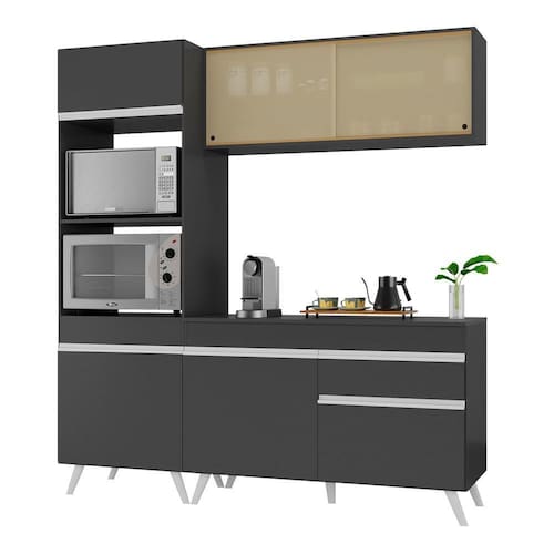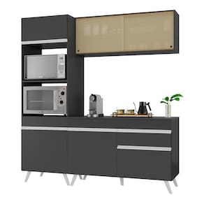 Conteúdo da Embalagem: 1 (um) armário aéreo com portas de vidro 120cm 1 (um) balcão com tampo 120cm 1 (um) armário para forno e microondas 62cm