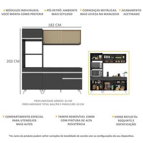 Dimensões do produto montado: Cozinha - Altura: 203cm | Largura: 182cm | Profundidade: 31cm (aéreo) - 53cm (paneleiro e balcão com tampo) *Você pode consultar as medidas internas na imagem técnica do produto.