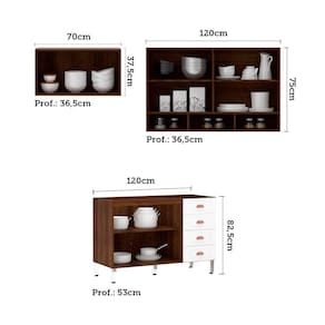 Ambiente composto por: ? 1 Armário Aéreo 120 cm 2 Portas com Nicho Safira Luciane Móveis 75 x 120 x 36,5 -Altura x Largura x Profundidade - cm- ? Armário Aéreo Basculante 70 cm 1 Porta Safira Luciane Móveis 37,5 x 70 x 36,5 -Altura x Largura x Profundidade - cm- ? Balcão de Pia sem Tampo 120cm 2 Portas 4 Gavetas Safira Luciane Móveis 82,5 x 120 x 53 -Altura x Largura x Profundidade - cm-