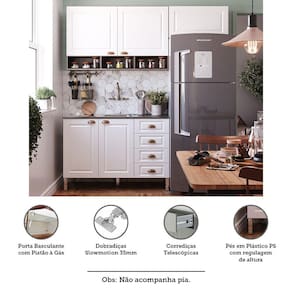 Informações Complementares: Porta Basculante com abertura auxiliada por Pistão à Gás. Prateleiras suportam até 9kg, bases 10kg e nichos 2kg. Distribua uniformemente os objetos. Balcão 120cm pode ser utilizado com tampo ou pia, porem nenhuma das opções acompanha o produto.