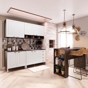 A Cozinha Safira traz design e sofisticação, a combinação perfeita entre beleza e funcionalidade. Desenvolvida em MDP, o que garante qualidade e durabilidade. Conta puxadores Bronze e pés com regulagem de altura no acabamento PS Cromado.