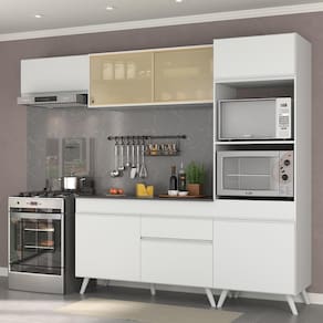 Conteúdo da Embalagem: 1 (um) armário aéreo 70cm 1 (um) armário aéreo com portas de vidro 120cm 1 (um) balcão com tampo 120cm 1 (um) armário para forno e microondas 62cm