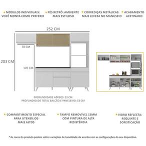 Dimensões do produto montado: Cozinha - Altura: 203cm | Largura: 252cm | Profundidade: 32cm (aéreos) - 53cm (paneleiro e balcão com tampo) Espaço para fogão/geladeira - Altura: 170cm | Largura: 70cm *Você pode consultar as medidas internas na imagem técnica do produto.