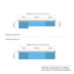 Uma cozinha modulada completa, para deixar seu ambiente super aconchegante e requintado. Composta por 5 peças cuidadosamente pensadas para sua organização. As portas embutidas remetem ao planejado, com acabamento impecável. Os módulos são montados individualmente e permite a instalação da forma que melhor se adeque ao seu espaço. Contém um nicho com espaço para forno micro-ondas e Vidro Reflecta. Para este ambiente utilizamos como proposta 270cm de parede linear.