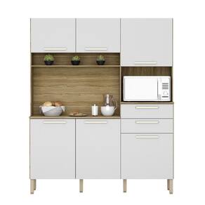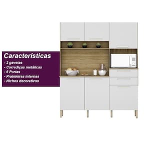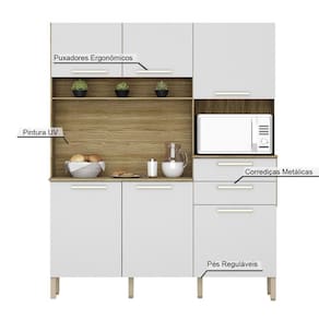 Conta com nicho para pequenos objetos, além disso, tem nicho para micro-ondas e passa-fio no traseiro facilitando o acesso à tomada na parede. O espaço interno é bem dividido com a utilização de prateleiras, para melhor organizar os utensílios da cozinha.