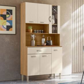 Com seis portas, sendo uma delas com vidro incolor e detalhe serigrafado, este Armário combina praticidade e beleza. Ele também inclui uma gaveta, ideal para a disposição de talheres ou outros itens de sua preferência. O Nicho na parte superior é perfeito para expor objetos decorativos e temperos, trazendo leveza ao Armário de Cozinha Simples e contribuindo para uma decoração charmosa. A textura cristalo na frente das portas e gaveta confere um design moderno que se destaca no ambiente.