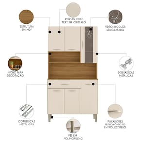 É fabricado em MDF de 12mm com acabamento em pintura UV, garantindo alta qualidade e resistência para a Cozinha Compacta. As dobradiças e corrediças metálicas proporcionam uma abertura e fechamento suave, enquanto os puxadores ergonômicos em poliestireno tornam o uso ainda mais prático e confortável. Com uma prateleira interna, possui espaço para organizar utensílios, louças e eletrodomésticos. Os pés fixos em plástico resistente de polipropileno, asseguram a sustentação e estabilidade do Armário de Cozinha.