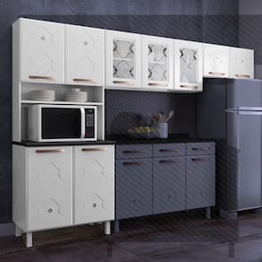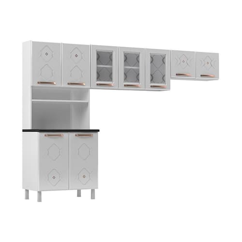 O Armário de Cozinha Compacta de Aço 3 Peças para Micro-ondas com Vidros Multimóveis CR20350 é sinônimo de qualidade, resistência e brilho para a sua cozinha. Essa composição conta com 3 módulos robustos - fabricados inteiramente em aço - que passam por pintura eletrostática de acabamento brilhoso, um processo que confere qualidade, proteção anticorrosiva e mais resistência ao móvel. Internamente, é possível acomodar panelas, louças, travessas ou alimentos de maneira organizada e funcional. O módulo kit é um aliado no dia a dia: com espaço para micro-ondas, forno ou qualquer eletro que você precise ter sempre ao alcance das mãos de forma prática e ergonômica, ele é amplo e robusto. Já o armário aéreo é um daqueles módulos queridinhos para armazenar e também decorar a cozinha, além dos belos vidros serem serigrafados e temperados, para maior segurança. As delicadas serigrafias harmonizam com os apliques em alto relevo e puxadores elegantes.