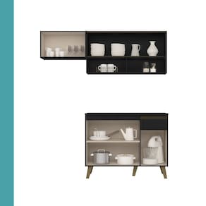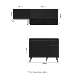 Composta por módulos versáteis, conta com um armário aéreo de duas portas de vidro e nicho incluso, um armário aéreo de 60cm e um balcão de 105cm com gaveteiro. Equipada com puxadores e pés em ABS, dobradiças e corrediças metálicas e elaborada em MDP de alta qualidade, essa cozinha oferece durabilidade, resistência e sofisticação em cada detalhe!