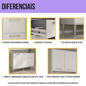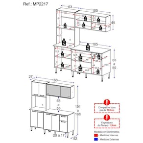 Dimensões do produto montado: Armário Aéreo - Altura: 45cm | Largura: 105cm | Profundidade: 27cm Armário para Micro-ondas: Altura: 191cm | Largura: 63cm | Profundidade: 27cm Balcão - Altura: 88cm | Largura: 105cm | Profundidade: 52cm *Você pode consultar as medidas detalhadas na imagem técnica do produto.