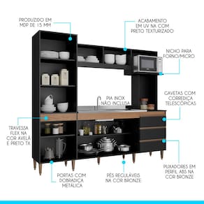 Caracter?sticas: Produzida em MDP de 15 mm Acabamento UV Detalhe Travessa Flex na cor Preto e Avel? Portas com Dobradi?as Met?licas Gavetas com Corredi?as Telesc?picas Puxadores Perfil em ABS P?s Regul?veis em ABS ATEN??O: Balc?o para Pia de Larg. 120 x Prof. 52 cm, N?O acompanha TAMPO e PIA