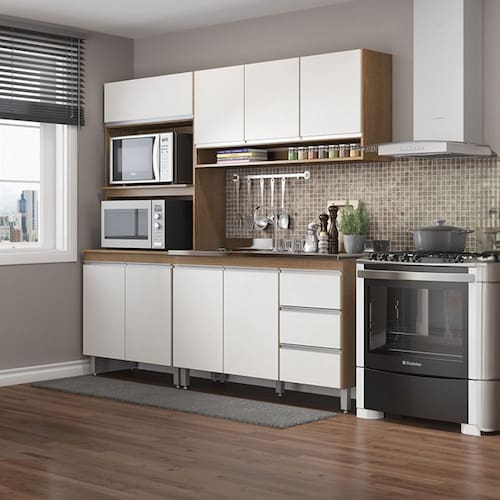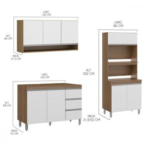 Conteúdo da Embalagem 1 Armário Aéreo 120 cm | 1 Balcão Pia 120 cm | 1 Torre Nicho para Forno e Micro-ondas 80 cm