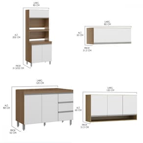 Características da cozinha Produzida em MDP de 15 mm com acabamento UV nas cores branco e avelã, portas com dobradiças metálicas e porta basculante com pistão a gás. Gavetas com corrediça telescópica, puxadores perfil em ABS na cor prata e pés com regulagem na mesma tonalidade. Nicho superior para forno com 40 cm de altura, 77 cm de largura e 50,5 cm de profundidade. Nicho inferior para micro-ondas com 35 cm de altura, 77 cm de largura e 50,5 cm de profundidade. Balcão para pia com 120 cm de largura e 52 cm de profundidade, não acompanha tampo nem pia.