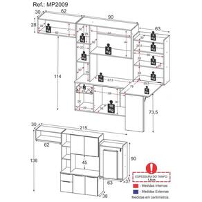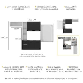 Dimensões do produto montado: Cozinha - Altura: 138cm | Largura: 152cm | Profundidade: 30cm (aéreos) - 38cm (balcão com tampo) Mesa Dobrável (aberta) - Altura: 163,5cm | Largura: 63cm | Profundidade: 107cmEspaço para fogão/geladeira - Altura: ajustável - Largura: 62cm *Você pode consultar as medidas internas na imagem técnica do produto.