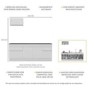 Dimensões do produto montado: Altura: 203cm | Largura: 220cm | Profundidade: 32cm (aéreo) - 53cm (balcão com tampo) *Você pode consultar as medidas internas na imagem técnica do produto. *As cores do produto podem sofrer variações de tonalidade de acordo com as configurações do seu dispositivo.