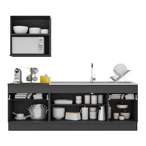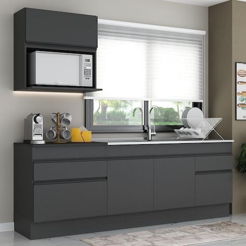 Conteúdo da Embalagem: 1 (um) armário aéreo 70cm 1 (um) módulo para microondas 1 (um) balcão com tampo 70cm 1 (um) balcão com tampo 150cm 1 (um) kit com rodapés