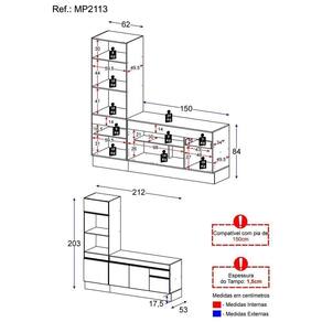 Dimensões do produto montado: Altura: 203cm | Largura: 212cm | Profundidade: 53cm (balcão com tampo e paneleiro) *Você pode consultar as medidas internas na imagem técnica do produto. *As cores do produto podem sofrer variações de tonalidade de acordo com as configurações do seu dispositivo.