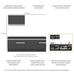 Dimensões do produto montado: Altura: 203cm | Largura: 270cm | Profundidade: 32cm (aéreos) - 53cm (balcão com tampo) *Você pode consultar as medidas internas na imagem técnica do produto. *As cores do produto podem sofrer variações de tonalidade de acordo com as configurações do seu dispositivo.