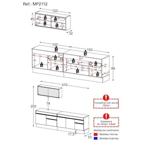 Dimensões do produto montado: Altura: 203cm | Largura: 270cm | Profundidade: 32cm (aéreos) - 53cm (balcão com tampo) *Você pode consultar as medidas internas na imagem técnica do produto. *As cores do produto podem sofrer variações de tonalidade de acordo com as configurações do seu dispositivo.