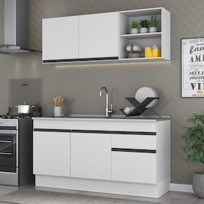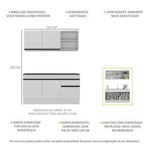 Conteúdo da Embalagem: 1 (um) armário aéreo 150cm 1 (um) balcão com tampo 150cm 1 (um) kit com rodapés