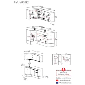 Altura: 203cm | Largura: 90 x 172cm | Profundidade: 32cm (aéreos) - 53cm (balcão com tampo)