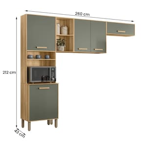 Modelo: Cozinha Maria Flor; Material da estrutura: MDP em 12 mm e 15 mm; Dimensões: 260 cm(L) x 212 cm(A) x 43 cm(P) Profundidade inferior: 43 cm; Profundidade superior: 29,9 cm; Quantidade de portas: 05 (dobradiças metálicas); Com puxador: sim, em MDF; Quantidade prateleiras: 5; Pés com regulagem: Sim, em plástico; Peso suportado: até 55 kg distribuídos; Requer montagem: Sim (kit montagem incluso).
