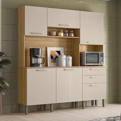 A cozinha Italia, além de trazer todo o conceito de amplitude e organização para o ambiente, conta com uma estrutura 100% em MDF, garantindo maior resistência e durabilidade. Seu design inteligente com amplas repartições e nichos facilita o armazenamento de objetos e itens diversos, enquanto o espaço dedicado ao forno ou micro-ondas agrega praticidade. O acabamento com pintura fosca e textura sensível ao toque não só valoriza o visual, mas também respeita o meio ambiente.