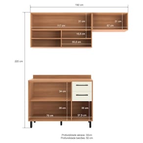 Dimensões do produto montado: Altura: 220cm | Largura: 190cm | Profundidade: 50cm (balcão) - 30cm (armários aéreos) Espaço para fogão/geladeira: Altura: 186cm | Largura: 70cm *Você pode consultar as medidas detalhadas na imagem técnica do produto.