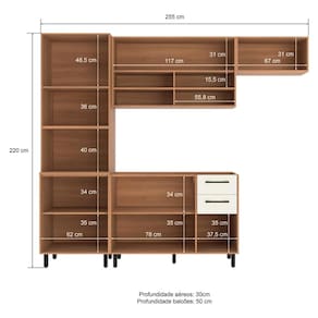 Dimensões do produto montado: Altura: 220cm | Largura: 255cm | Profundidade: 50cm (balcão) - 30cm (armários aéreos) Espaço para fogão/geladeira: Altura: 186cm | Largura: 70cm *Você pode consultar as medidas detalhadas na imagem técnica do produto.
