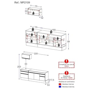Dimensões do produto montado: Altura: 203cm | Largura: 220cm | Profundidade: 32cm (aéreo) - 53cm (balcão com tampo) *Você pode consultar as medidas internas na imagem técnica do produto. *As cores do produto podem sofrer variações de tonalidade de acordo com as configurações do seu dispositivo.