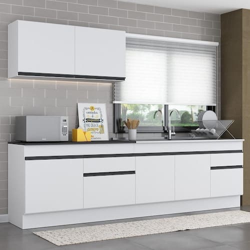 O produto será entregue desmontado e não disponibilizamos o serviço de montagem. Acabamento: Pintura Acetinada Texturizada | Cor: Branco/Preto | Tonalidade: Branco | Material: MDP | Referência do Modelo: MP2111 | Coleção: Veneza | Instruções de Cuidado: Limpar com pano seco para retirar o pó. Não utilizar lustra móveis e produtos químicos ou abrasivos à limpeza. | Sistema de Montagem: O produto acompanha manual de montagem juntamente com kit ferragem. O produto será entregue desmontado e não disponibilizamos o serviço de montagem. | Produto Composto por: 1 armário aéreo 120cm, 1 balcão com tampo 120cm, 1 balcão com tampo 150cm, 1 kit com rodapés, manual de montagem e kit ferragem. | Altura Montado: 203 | Largura Montado: 270 | Profundidade Montado: 53 | Tamanho (L x A x P): 270 x 203 x 53 | Peso do Produto: 98 | Garantia do Fabricante: 3 | Fabricante: Multimóveis | Requer Montagem: Sim | Quantidade de Portas: 7 | Quantidade de Gavetas: 2 | Quantidade de Prateleiras: 3 | Quantidade de Puxadores: 9 | Quantidade de Pés: 11 | Porta com Vidro: Não | Corrediça: Metálica | Material do Puxador: ABS | Material dos Pés: Polipropileno | Acompanha Pia Inox: Não | Balcão 120 cm compatível para uso de pia: Não | Tampo Incluso: Sim | Quantidade de Tampos: 2 | Material do Tampo: MDP | Espessura do Tampo: 1.5 | Com Prateleiras: Sim | Produto: Cozinha Compacta | Tipo: Modular | Altura (cm): 203 cm | Largura (cm): 270 cm | Profundidade (cm): 53 cm | Acessórios incluídos: N/A | Altura do Produto com Embalagem: 81 | Largura do Produto com Embalagem: 65 | Comprimento do Produto com Embalagem: 155 | Peso do Produto com Embalagem: 98 | Nome do Produto no Fornecedor: Armário de Cozinha Compacta com Rodapé Veneza Multimóveis MP2111.964 Branco/Preto | Descrição do Tamanho: (L x A X P): 270 cm x 203 cm x 53 cm | Tempo de Garantia: 3 meses | Estado de Origem: RS | Produto precisa de Montagem?: Sim, sugerimos a contratação do nosso serviço de montagem (para os CEPs em que o serviço está disponível) ou de algum profissional experiente de sua preferência | Ubicação do móvel: Não aplica | Destaque 1: MDP com acabamento acetinado: maior durabilidade e resistência. | Destaque 2: Balcão com tampo removível: pode ser utilizado com pia. | Destaque 3: Gavetas com corrediças metálicas: mais leveza no manuseio. | Destaque 4: Garantia de 90 dias contra defeitos de fabricação. | Destaque 5: Os módulos são individuais e você pode montar da maneira que se adaptar melhor ao seu ambiente.