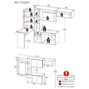 Dimensões do produto montado: Cozinha - Altura: 138cm | Largura: 152cm | Profundidade: 30cm (aéreos) - 38cm (balcão com tampo) Mesa Dobrável (aberta) - Altura: 163,5cm | Largura: 63cm | Profundidade: 107cmEspaço para fogão/geladeira - Altura: ajustável - Largura: 62cm *Você pode consultar as medidas internas na imagem técnica do produto.
