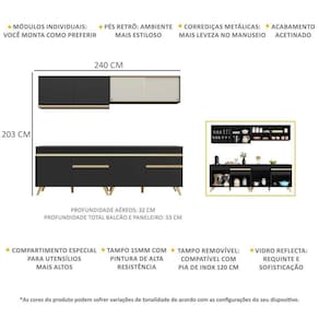 Dimensões do produto montado: Cozinha - Altura: 203cm | Largura: 240cm | Profundidade: 32cm (aéreos) - 53cm (balcão com tampo) *Você pode consultar as medidas internas na imagem técnica do produto.