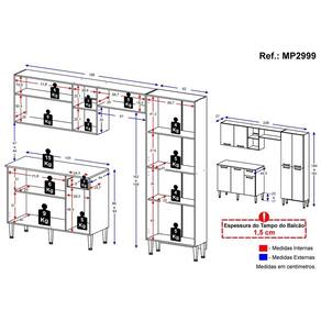 Dimensões do produto montado: Cozinha: Altura: 184cm | Largura: 228cm | Profundidade: 27cm (aéreos e paneleiro) - 44,5cm (balcão com tampo) Espaço do nicho para fogão/geladeira: Altura: 162cm | Largura: 61cm *Você pode consultar as medidas internas na imagem técnica do produto.
