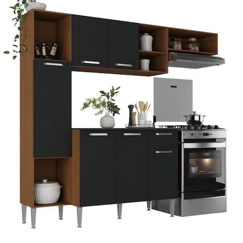 Armário De Cozinha Compacta Smart Multimóveis Mp2219 Madeirado/preto Madeirado/preto O Armário de Cozinha Compacta Smart Multimóveis MP2219 é produzido em MDP 12/15mm com acabamento acetinado (cerca de 20% de brilho), este armário oferece durabilidade e resistência. Com amplo espaço interno, possui 6 portas com dobradiças metálicas, 1 gaveta com corrediças metálicas (mais leveza no manuseio), nichos e prateleiras para armazenar todos os itens essenciais da cozinha, mantendo-os ao alcance das mãos e bem organizados. O espaço dedicado para fogão ou geladeira oferece ainda mais versatilidade, permitindo que você aproveite ao máximo o espaço disponível. Além disso, conta com pés em polipropileno com regulagem de altura, que proporcionam estabilidade, e puxadores em ABS que agregam um toque moderno e elegante. Versátil, a porta do paneleiro conta com 3 opções de montagem, possibilitando que você escolha entre ela estar na parte de cima, de baixo ou no meio. Os módulos NÃO podem ser montados separadamente e o balcão NÃO é compatível para utilização de pia. Esta cozinha é perfeita para unir sofisticação e funcionalidade em pequenos espaços! Conteúdo da Embalagem: 1 (um) Paneleiro 30,4cm 1 (um) Armário Aéreo 150,6cm 1 (um) Balcão com Tampo 90cm Manual de Montagem Kit Ferragem
