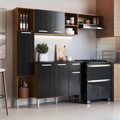 Fabricada em MDP de 12/15mm com acabamento acetinado (cerca de 20% de brilho), esta cozinha compacta é sinônimo de resistência e durabilidade. Seu design inteligente conta com 6 portas, 1 gaveta com corrediças metálicas (garantindo leveza no manuseio), além de nichos e prateleiras que ajudam a manter tudo organizado e facilmente acessível.
