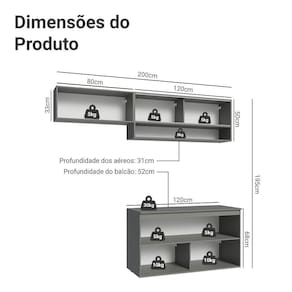 52 cm de profundidade no balcão e 31 cm nos aéreos