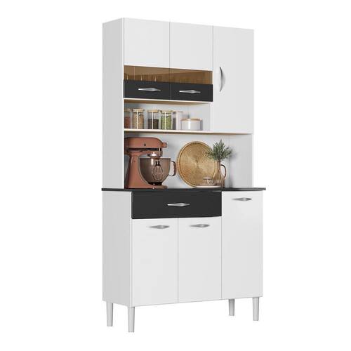 O Kit Vogue é produzido em MDP de 12 e 15 mm, proveniente de madeira de reflorestamento. Possui seis portas, sendo duas portas superiores com vidro temperado, e uma ampla gaveta. Conta com prateleira interna, tampo que pode ser utilizado como bancada e quatro pés fixos em plástico resistente, garantindo estabilidade. As portas e gaveta possuem dobradiças e corrediças metálicas que proporcionam abertura suave e segura. Os puxadores ergonômicos em plástico resistente possuem acabamento cinza metalizado. O acabamento das portas e gavetas é em pintura UV com verniz alto brilho nos padrões linho branco e linho preto, e pintura fosca texturizada nos padrões arena, petróleo e nogal, com secagem UV, facilitando a limpeza e conferindo visual moderno.