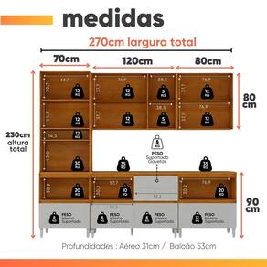 Importante sobre a : A é realizada até a portaria ou porta de entrada do indicado, desde que o acesso seja permitido. Para locais com portaria, a será feita no piso térreo. Não realizamos montagem, desmontagem, por escadas ou içamento. É responsabilidade do cliente verificar se as dimensões do produto são compatíveis com portas, elevadores e corredores. Evite imprevistos: confira todos os detalhes antes de concluir sua compra. MEDIDAS:: A = 230 cm (com pés) L = 270 cm P = 53 cm | ALTURA PÉS:: A = 14,5 cm | PRATELEIRAS SUPORTAM ATÉ:: 5, 10, 12 e 20 kg | GAVETAS SUPORTAM ATÉ:: 5, 8 e 12 kg | NICHOS SUPORTAM ATÉ:: 12 e 30 kg | TAMPO SUPORTA ATÉ:: 35 kg | PESO:: 214,4 kg | MODELO:: Armário De Cozinha Completa 10 Portas 6 Gavetas Lais Madeirado/Fendi Itatiaia | MARCA:: Itatiaia | COR:: Madeirado/Fendi | MATERIAL:: MDF | ESPESSURA DO MATERIAL:: 15 mm | PINTURA:: UV de alta qualidade | ACABAMENTO:: Fosco | PORTAS:: 10 | TIPO DE PORTA:: Bater / Basculantes | DOBRADIÇAS:: Slow Motion (35mm) | PISTÃO A GÁS:: Sim | NICHOS:: 2 | PRATELEIRAS:: 4 | GAVETAS:: 6 | CORREDIÇAS:: Telescópicas | QUANTIDADE DE PUXADORES:: 7 | TIPO DE PUXADORES:: Aste / Cava | MATERIAL DOS PUXADORES:: Alumínio | MATERIAL DO TAMPO:: MDP | ESPESSURA DO TAMPO:: 25 mm | PÉS:: 13 (reguláveis) | MATERIAL DOS PÉS:: Plástico | SISTEMA DE MONTAGEM:: Parafusos e cavilhas | DIFERENCIAIS:: Design elegante / Vidro reflecta moderno / Gavetas com corrediças telescópicas / Amplo espaço para melhor armazenamento / Dobradiças Slow motion / Pistão a gás / Pés reguláveis / Balcão com possivel adaptação para cooktop. | OBSERVAÇÃO:: Tampo do balcão adaptável para cooktop não possui recorte. | ITENS INCLUSOS:: 1 paneleiro, 1 aéreo vidro reflecta, 1 aéreo 2 portas, 1 balcão 1,20m, 1 balcão 0,80m, 1 manual de montagem, 1 kit parafusos. | INSTRUÇÕES E CUIDADOS:: Para maior durabilidade, recomendável que a limpeza dos móveis seja feita com pano limpo e seco. Não usar produtos químicos ou abrasivos | GARANTIA:: 3 meses pelo fabricante. | AVISO:: Importante sobre a : A é realizada até a portaria ou porta de entrada do indicado, desde que o acesso seja permitido. Para locais com portaria, a será feita no piso térreo. Não realizamos montagem, desmontagem, p | Requer montagem: Sim | Tipo de móveis de cozinha: Armário | Altura da embalagem: 103 cm | Comprimento da embalagem: 145 cm | Largura da embalagem: 56 cm | Peso da embalagem: 21565 g | Cor: Madeirado / Fendi