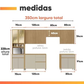 Importante sobre a entrega: A entrega é realizada até a portaria ou porta de entrada do endereço indicado, desde que o acesso seja permitido. Para locais com portaria, a entrega será feita no piso térreo. Não realizamos montagem, desmontagem, transporte por escadas ou içamento. É responsabilidade do cliente verificar se as dimensões do produto são compatíveis com portas, elevadores e corredores. Evite imprevistos: confira todos os detalhes antes de concluir sua compra. MEDIDAS ARMÁRIO:: A = 228 cm (com pés) L = 350 cm P = 52 cm | ALTURA PÉS:: A = 10 cm | PRATELEIRAS SUPORTAM ATÉ:: 15 kg | TAMPO SUPORTA ATÉ:: 30 kg | MARCA:: Nesher | GAVETAS SUPORTAM ATÉ:: 5 kg | NICHOS SUPORTAM ATÉ:: 15 kg | PESO SUPORTADO:: 320 kg | PESO:: 234,6 kg | MODELO:: Armário De Cozinha Completa 100% Mdf 12 Portas 5 Gavetas Cléo Raissa Carvalho/Off White | COR:: Carvalho/Off White | MATERIAL:: MDF | ESPESSURA DO MATERIAL:: 15 mm | PINTURA:: UV de alta qualidade | ACABAMENTO:: Fosco | TIPO DE PORTA:: Bater / Basculantes | DOBRADIÇAS:: Slow Motion | PISTÃO A GÁS:: Sim | PRATELEIRAS:: 11 | NICHOS:: 2 | GAVETAS:: 5 | CORREDIÇAS:: Telescópicas (3 estágios) | PUXADORES:: Cava | SISTEMA DE MONTAGEM:: Parafusos, minifix e cavilhas | PORTAS:: 12 | MATERIAL DO TAMPO:: MDF | ESPESSURA DO TAMPO:: 30 mm | MATERIAL DOS PÉS:: Plástico | PÉS:: 13 (reguláveis) | DIFERENCIAIS:: Estrutura 100% MDF / Paneleiro com vidro reflecta moderno / Gaveta com organizador de talheres / Nicho com espaço para micro ondas / Espaço para geladeira / Corrediças telescópicas 3 estágios / Dobradiças Slow motion / Pistão a gás / Pés reguláveis. | INSTRUÇÕES E CUIDADOS:: Para maior durabilidade, recomendável que a limpeza dos móveis seja feita com pano limpo e seco. Não usar produtos químicos ou abrasivos | GARANTIA:: 3 meses pelo fabricante. | AVISO:: Importante sobre a entrega: A entrega é realizada até a portaria ou porta de entrada do endereço indicado, desde que o acesso seja permitido. Para locais com portaria, a entrega será feita no piso térreo | Requer montagem: Sim | Tipo de móveis de cozinha: Armário | Altura da embalagem: 98 cm | Comprimento da embalagem: 143 cm | Largura da embalagem: 61 cm | Peso da embalagem: 21565 g | Tipo da embalagem: sem embalagem adicional | Cor: Madeirado/Off White