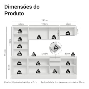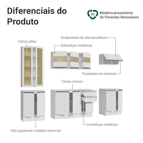 Fabricada em 100% MDF, a linha Smart oferece durabilidade e acabamento de alta resistência. A estrutura e as frentes são em acabamento branco. Os aéreos e a cristaleira se destacam pelas portas com vidro reflex, que adicionam elegância ao ambiente.