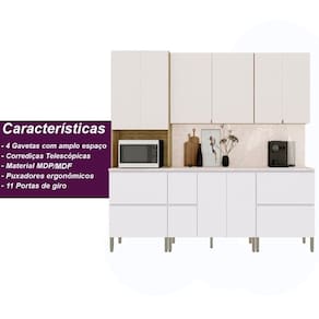 Material: MDP/MDF | Cor: Freijó/Vanilla/CP Riscatto Freijó | Cômodo Indicado: Cozinha | Dimensões do Produto (A X L X P): 222 x 280 x 53 | Possui Prateleira: Sim | Possui Gaveta: Sim | Tipo da Corrediça da Gaveta: Telescópicas | Possui portas: Sim | Quantidade de portas: 11 Portas | Tipo de Porta: Bater | Possui porta Basculante: Sim | Possui Pistão á Gás: Sim | Possui Nichos: Sim | Possui pés: Sim | Dobradiças com Amortecedor: Sim | Portas Articuladas: Sim | Peso do Produto (Kg): 177.1 | Altura do Produto (cm): 222 | Largura do Produto (cm): 280 | Comnto do Produto (cm): 53 | Nome do Simples no Fornecedor: Art | Garantia do Fabricante: 90 dias | Instruções/Cuidados: Evite contato com líquidos. Nada de lavar os móveis. Móveis não gostam de umidade. Não deixe o móvel exposto ao sol. Os acessórios também precisam de limpeza. | Precisa de Montagem: Sim, a montagem é simples mas sugerimos a contratação de algum experiente de sua preferência | Material da Estrutura: MDP/MDF | Necessita Fixação na Parede: Não | Conteúdo Embalagem: Cozinha Completa Art | Origem: Nacional | Estado de Origem: Paraná | Quantidade de Volumes: 9 | Peso Bruto (volume 01): 17 | Comnto x Largura x Altura (volume 01): 85 x 40 x 10 | Peso Bruto (volume 02): 29,4 | Comnto x Largura x Altura (volume 02): 125 x 60 x 78 | Peso Bruto (volume 03): 25,1 | Comnto x Largura x Altura (volume 03): 84 x 50 x 11 | Peso Bruto (volume 04): 30,8 | Comnto x Largura x Altura (volume 04): 150 x 50 x 77 | Peso Bruto (volume 05): 2,1 | Comnto x Largura x Altura (volume 05): 53 x 42 x 7 | Peso Bruto (volume 06): 35,5 | Comnto x Largura x Altura (volume 06): 99 x 53 x 14 | Peso Bruto (volume 07): 19,1 | Comnto x Largura x Altura (volume 07): 159 x 39 x 56 | Peso Bruto (volume 08): 8,9 | Comnto x Largura x Altura (volume 08): 84 x 53 x 36 | Peso Bruto (volume 09): 13,5 | Comnto x Largura x Altura (volume 09): 124 x 53 x 36 Cor: Freijó/Artico/Soft