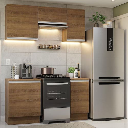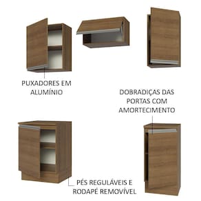 Os materiais utilizados na fabricação da cozinha são de qualidade superior. Possui puxadores em alumínio e amortecedores para fechamento suave das portas. Além disso, conta com pés reguláveis em PVC e rodapé removível em MDP.