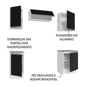 Este móvel possui puxadores em alumínio, amortecedores para fechamento suave das portas e corrediças telescópicas que permitem a abertura total das gavetas. Além disso, tem pés reguláveis em PVC e rodapé removível em MDP.