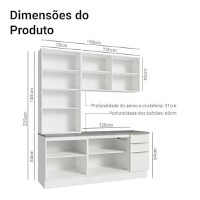 - 60 cm de profundidade nos balcões e 31 cm no aéreo e na cristaleira