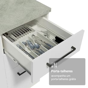 O móvel conta com puxadores com alça em alumínio, gavetas com corrediças telescópicas de abertura total, portas com amortecimento para fechamento suave e pés reguláveis em PVC.
